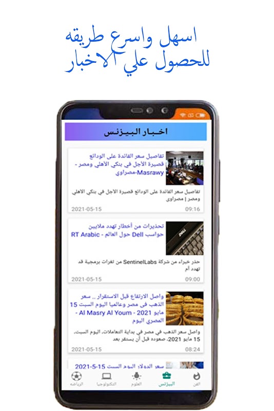 Dove il programma è suddiviso in notizie sportive - notizie tecnologiche - notizie d'arte - notizie scientifiche e notizie economiche, dove ogni sezione ti consente di conoscere tutte le notizie urgenti da più di una fonte, ad esempio, la sezione Notizie sportive mostra notizie da (Yallakora - Il settimo giorno -