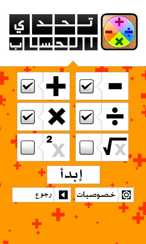 تحدي الحساب هي لعبة رياضيات و حساب باللغة العربية الهدف منها هو تعليم الأطفال و حتى البالغين الحساب الذهني ، تعلم العمليات الحسابية : الجمع ، الطرح الضرب و القسمة , كما يمكنك تعلم الأس و الجذر للمستويات الصعبة بنوعين من الكتابة : الأرقام العربية (1 2 3 ...) أو الأرقام الهندية (۱ ۲ ۳ ٤)