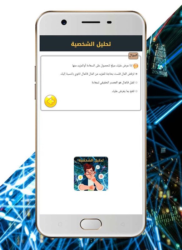 يحتوي التطبيق على سلسلة من الاسئلة التي تتعلق باكثر من جانب من جوانب الشخصية و تحلل الشخصية من عدة نواح