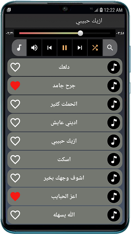 قائمة الأغاني الموجودة في التطبيق: