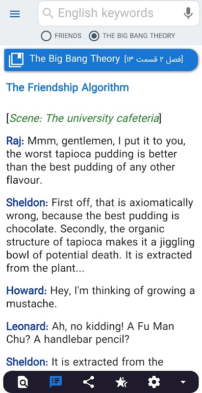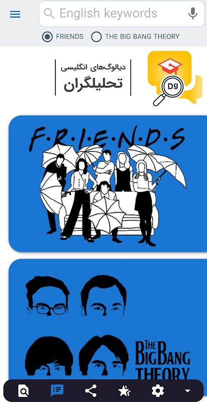 Nei dialoghi in inglese degli analisti con più di 100.000 frasi comuni ed esempi della lingua inglese, sono stati compilati i dialoghi in inglese delle serie FRIENDS e THE BIG BANG THEORY ed è stata aggiunta la possibilità di cercare parole combinate.