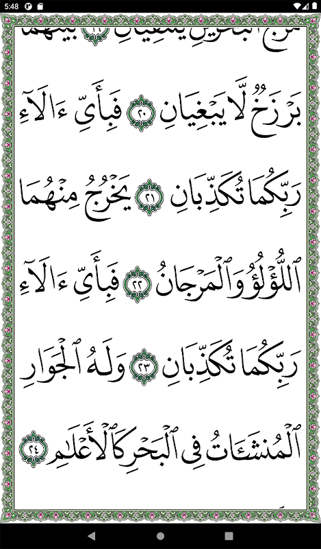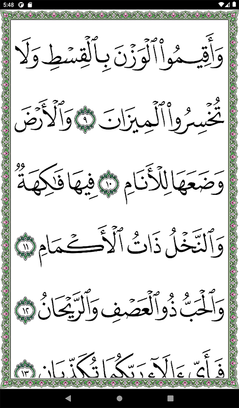 Applicazione di Surat Al-Rahman in grande calligrafia per facilitare la lettura da dispositivi mobili per anziani e ipovedenti. L'applicazione visualizza il testo coranico in caratteri Uthmani, che è identico al Corano della Città del Profeta, con una grafia grande e chiara. L'applicazione consente anche la ricerca rapida per andare direttamente a un versetto sacro cercando una parola o effettuando una ricerca per numero di versetto.