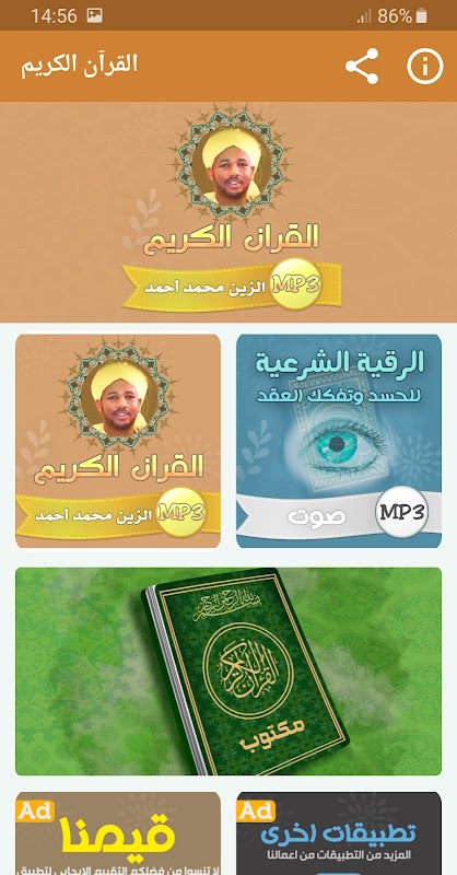 L'applicazione del Nobile Corano è completa, con la voce del recitatore Al-Zain Muhammad Ahmed, che ti permette di ascoltare facilmente le sure del Corano in modo che tu possa divertirti recitando il Corano con un suono acuto qualità