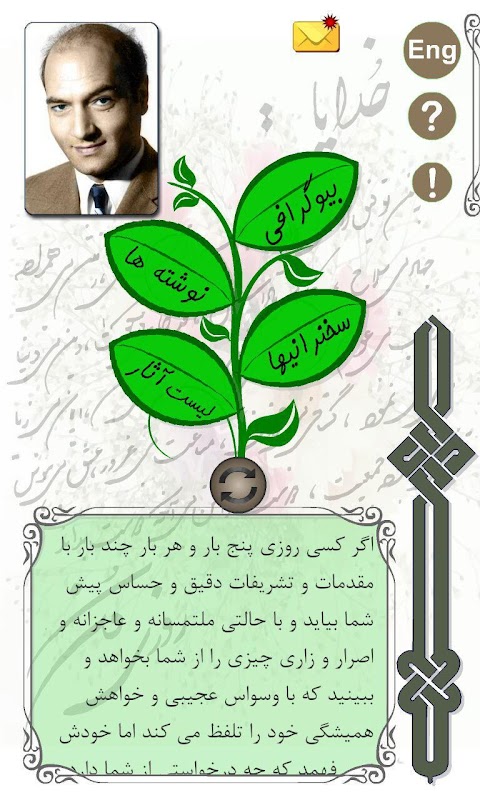 Applicazione dedicata a uno degli scrittore più influente, intellettuale, sociologa, e figure politiche di dell'Iran per-rivoluzione dell'era - Dr. Ali Shariati. Applicazione pagina principale inizia con una delle sue famose citazioni in fondo, e un albero che cresce con 4 filiali (selezioni):