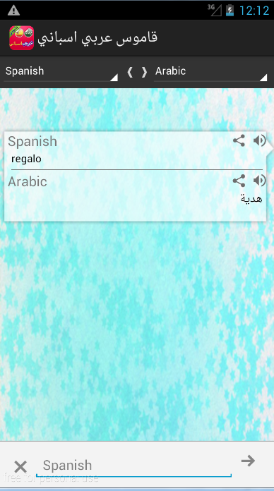 قاموس ومترجم فوري من العربية إلى الاسبانية ومن الاسانية إلى العربية، قمنا بتصميمه ليكون رفيقا لك في الدراسة والعمل, هذا المترجم خفيف وسهل الإستعمال, إضافة إلى أنه يشتغل في أغلب انظمة الاندرويد.