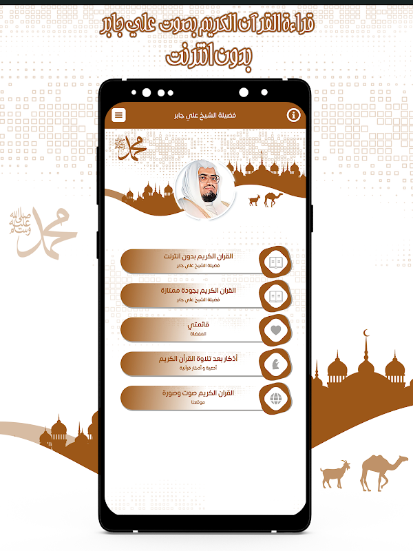 L'applicazione del Sacro Corano consente la voce di Ali Jaber. Puoi ascoltare tutte le sura del Nobile Corano attraverso il tuo cellulare o tablet con facilità attraverso un programma che contiene tutte le sura del Sacro Corano, e l'applicazione di recitare il Corano con la voce di Ali Jaber è gratuita in quanto disponibile sullo store per telefoni Android. Per divertirti a recitare il Sacro Corano con la voce dello sceicco Ali Jaber ovunque tu voglia.