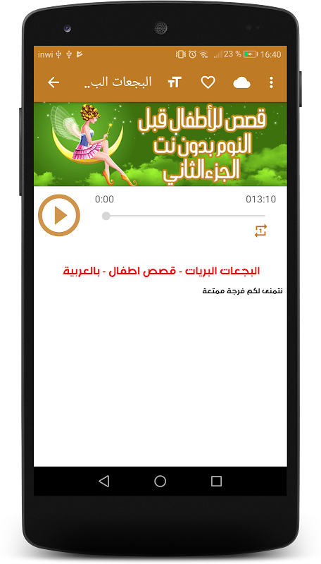 السلام عليكم ، نقدم لكم تطبيق حصري في محتواه وهو تطبيق قصص اطفال قبل النوم ، بحيث أنه تطبيق يشتغل بدون نت ، تطبيق قصص الأطفال بالعربي ، وبأزيد من 15 قصة للأطفال ، قبل النوم ، تساعدكم هذه القصص القصيرة للأطفال على نوم اطفالكم واستمتاعهم بقصص خيالية رائعة ،و قصص اطفال قصيرة ، بالاضافة إلى عدة مميزات لهذا التطبيق قصص اطفال قبل النوم ، نوفر لكم مجموعة متنوعة من القصص ترضي جميع الأذواق عددها حوالي 15 قصة مميزة ، وتحتوي حكايات اطفال ، على شخصيات خيالية مشهورة ، كبائعة الكبريت ، وأميرة الثلج ، السيدات الصغيرات ، بائعة الثقاب الصغيرة ، البازلاء الخمس ، الاميرات الراقصات ، الامير السعيد ، ملكة الثلج ، وطيور الجنة ، بيبي ،الأقزام وصانع الأحذية ، وغيرها من الشخصيات ...