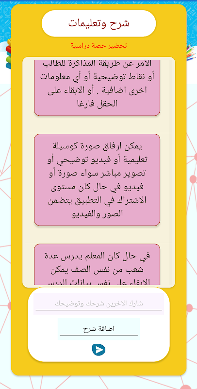 Questa applicazione è per il follow-up digitale e l'archiviazione elettronica di eventi e attività della giornata scolastica. E il mezzo di comunicazione tra scuola e genitori è quello di seguire quotidianamente lo studente, registrare e confermare l'andamento della giornata scolastica e condividerlo immediatamente con il genitore. D'altra parte, mira a distribuire i compiti tra gli insegnanti in modo che il carico sia ridotto, il lavoro sia più facile e i compiti non si accumulino. Ogni insegnante si preoccupa delle sue informazioni, inserisce i suoi dati e risponde facilmente alle sue osservazioni e richieste. L'applicazione fornisce tutte le operazioni necessarie per la gestione, effettuare statistiche e confronti, e facilitare l'accesso alle informazioni e l'accesso ai dati per coloro che hanno poteri di accesso. Gestione integrata tramite telefono senza la necessità di un computer o un sito Web dove tutti i dati sono controllati e gestito tramite l'applicazione del telefono. Con la possibilità di collegamento diretto al computer, ovviamente. L'applicazione è stata suddivisa in livelli in modo che la scuola determini l'ambizione che si desidera raggiungere, quindi una scuola può iniziare solo registrando lezioni e compiti, dopodiché si desidera attivare il livello successivo fino a raggiungere l'attivazione dell'intero applicazione per includere tutti i processi dalle lezioni e dai compiti per raggiungere l'inserimento dei voti, la registrazione degli appunti accademici, la valutazione comportamentale e delle abilità dei materiali Puoi anche attivare chat e chat istantanea, o inviare lezioni video e aprire discussioni e interazioni, o finalmente raggiungere il sessione interattiva in remoto con audio e video .. e tanti altri dettagli e opzioni a piacere della scuola.