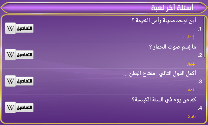 - إمكانية مراجعة جميع أسئلة آخر لعبة و أجوبتها و قراءة معلومات و تفاصيل إضافية متعلقة بالسؤال ( لقراءة المعلومات الإضافية يجب أن تتوفر على إتصال بالنت)