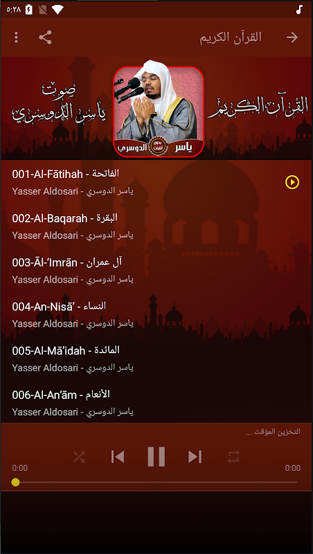 Applicazione del Sacro Corano con la voce di Yasser Al-Dosari