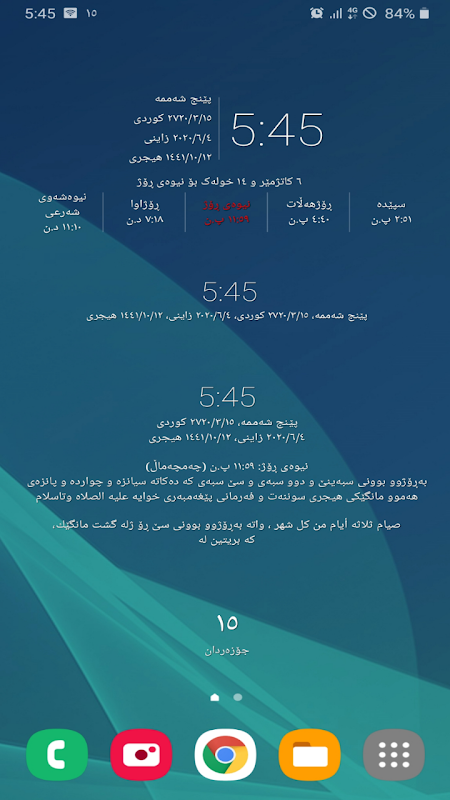 ١٨ـ دەتوانیت (ویجێتی) ی ئەم بەرنامەیە لەسەر شاشە دابنێیت کە هەر پێنج کاتی سپێدە و ڕۆژهەڵاتن و نیوەیو و و و ئە