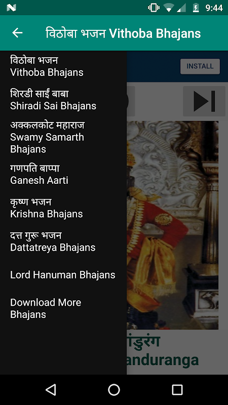 Ascolta Marathi Abhang, Bhanan, Gaulan e Bhaktigite. Abbiamo anche canzoni cantate da grandi artisti come Lata Mangeshkar, Usha Mangeshkar, Shankar Mahadevan, Anuradha Paudwal, Devaki Pandit, Sadhana Sargam, Sanjeev Abhyankar, Ganesh, Vitthal, Hanuman e Rama e così via.