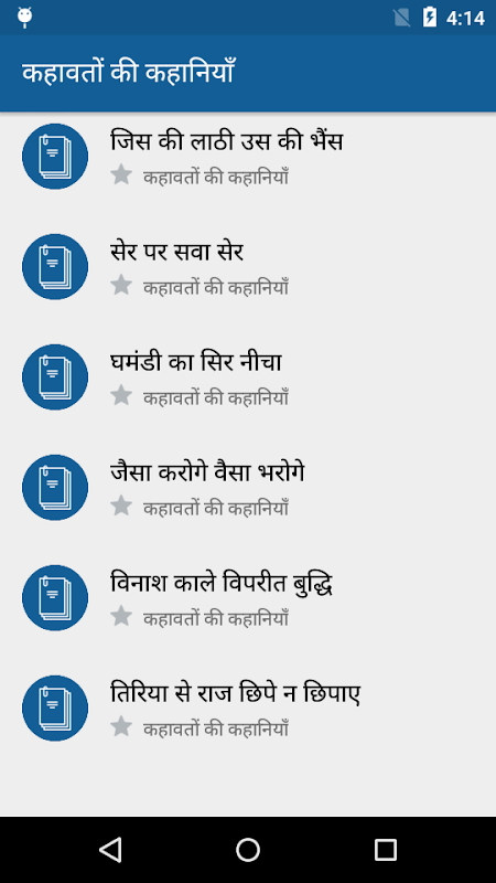 Huge collection of indian hindi stories( hindi kahaniya). Stories are are way to pass the gainful information to our next generations. This app contain big collection of indian hindi stories, which every one should know and pass it to our next generation. These stories are not only for entertainment but are the source of knowledge and information. You will know indian culture more nearly after reading all stories. if you will really like "Hindi Kahaniya" app, Please take a moment to rate this app. All suggesstions are welcome.