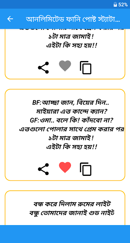 এই অ্যাপটির মাধ্যমে নিজ এবং আশে পাশের সকল বন্ধু বান্ধব ও আত্বীয়স্বজনদের কে সেই লেভের এর বিনোদন দেওয়া যাবে, কারও মন খারাপ নিয়ে আর চিন্তাই করতে হবে না, কেননা এই অ্যাপটি থেকে স্ট্যাটাস পড়ে হাসতেই যে হবে তাই।