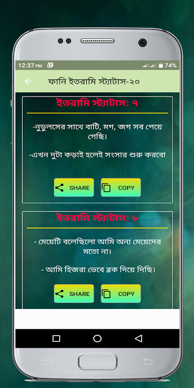 ইতরামি ফানি স্ট্যাটাস এই অ্যাপসটি থেকে মজার মজার অনলাইন স্ট্যাটাস পাবেন।