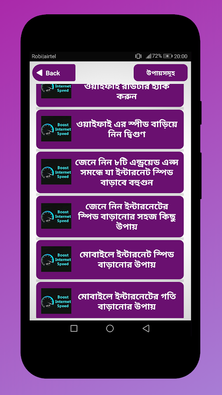 ইন্টারনেট স্পিড স্লো - এই সমস্যা প্রায় সবারই হয়। বিশেষ করে যারা মোবাইল ইন্টারনেট ব্যবহার করেন অর্থাৎ ৩জি বা ৪জি চালান তারা সবাই আশানুরুপ মোবাইলের ইন্টারনেটে স্পিড পান না। আবার অনেকে ব্রডব্যান্ড বা ওয়াইফাই ব্যবহার করলেও স্পিড কম হওয়ায় ইন্টারনেটের গতি বৃদ্ধি করতে চান। নেট স্পিড বা ইন্টেরনেটের স্পীড বাড়ানোর বেশ কিছু কৌশল আছে যা এই অ্যাপে আলোচনা করা হয়েছে।