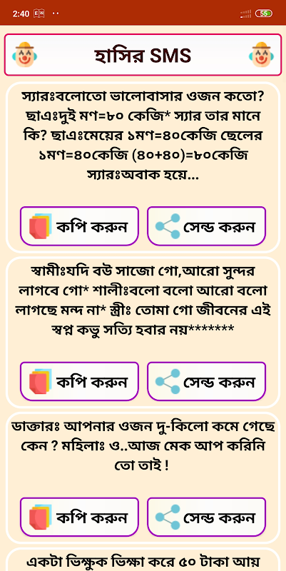 বিশেষ ফিচার: এই বাংলা এসএমএস - সব ধরনের বাংলা এস এম এস এ্যাপটিতে রয়েছে শেয়ার এবং কপি বাটন যার মাধ্যমে মাত্র একটিপে যে কোন এসএমএস 2020 যে কারো সাথে মুহুর্তের মধ্যে শেয়ার দিতে পারবেন কিংবা স্টাটাস আকারে দিতে পারবেন।
