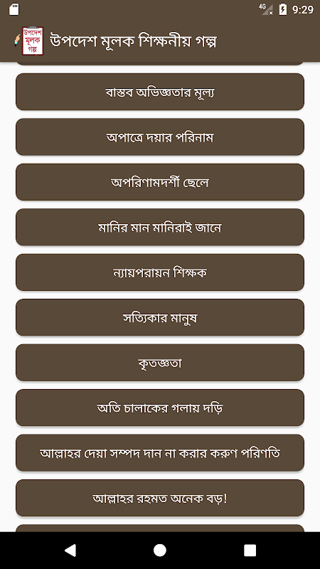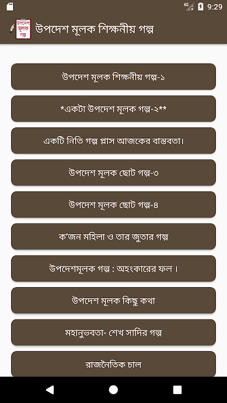 উপদেশ ও শিক্ষামূলক ছোট গল্প নিয়ে আমাদের এই অ্যাপটি সাজানো হয়েছে। এই অ্যাপটির মধ্যে বেশ কিছু জনপ্রিয় শিক্ষা ও উপদেশ মূলক ছোট গল্প দেয়া হয়েছে । এগুলো নতুন সংগ্রহীত করা হয়েছে । আশা করি আপনাদের ভাল লাগবে ।