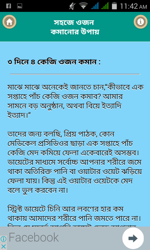 মুখে সবাই স্বাস্থ্য সকল সুখের মূল বলে কিন্তু এমন কোন মানুষ ই খুজে পাওয়া যাবে না যে কিনা অতিরিক্ত স্বাস্থ্যবান মানুষ ভালবাসে।আমাদের এই সহজে ওজন কমানোর উপায় অ্যাপ টি তে ওজন কমানোর সকল প্রকার উপায়ের কথা বিস্তারিত আলোচনা করা হয়েছে যা আপনাকে আরও সুন্দর ও লাবণ্যময়ী করে তুলবে। সহজে ওজন কমানোর উপায় সুধু একটি মোবাইল অ্যাপ্লিকেশান ই নয় বরং আপনার একটি সাহাস্থ চিকিৎসক।Nowadays it is almost impossible to find someone who likes overweight people. Our application will show you the way that how to weight lose simply. Our research team has passed a remarkable time on research and invented those ways to lose unexpected body weight. Easy way to weight lose will play vital role to reduce your weight and make you slim.