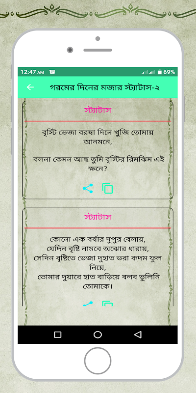 গরমের দিনের মজার স্ট্যাটাস এই অ্যাপসটি থেকে আপনারা দিনের এবং রাতের মজার স্ট্যাটাস পাবেন। গরমের দিনের রোমান্টিক এস এম এস স্ট্যাটাস পাবেন।আরো পাবেন বৃষ্টির দিনের ফানি রোমান্টিক কবিতা ছন্দ স্ট্যাটাস পাবেন। গরমের দিনের গরম রাতের স্ট্যাটাস - Stato divertente পাবেন। যা আপনারা অনলাইনে শেয়ার করে নিজে মজা পাবেন অন্যকে মজা দিতে পারবেন।
