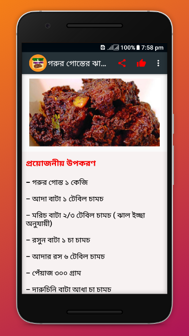 এ অ্যাপ থেকে যেসব রেসিপি জানতে পারবেনঃ গরুর মাংস দিয়ে তৈরীকৃত..