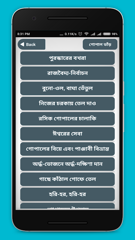 হাস্য রসে ভরা মজার কৌতুক mojar jokes ও নানা রকম mojar golpo মজার গল্প রয়েছে এই গোপাল ভাঁড় অ্যাপটিতে যা আপনাদের নির্মল বিনোদন দিবে।গোপাল ভাঁড়ের বিভিন্ন রকম মজার মজার গল্প gopal bharer golpo ও মজার জোকস দিয়েই আমাদের এই বাংলা এপ গোপাল ভাঁড়ের মজার গল্প gopal var golpo সাজানো হয়েছে। আশা করি এই বিনোদনমূলক বাংলা এপস গোপাল ভাঁড়ের গল্প gopal varer golpo মজার মজার কৌতুক ও গল্প এর মাধ্যমে বিনোদন দিবে যা আপনাদের ভাল লাগবে। ধন্যবাদ।