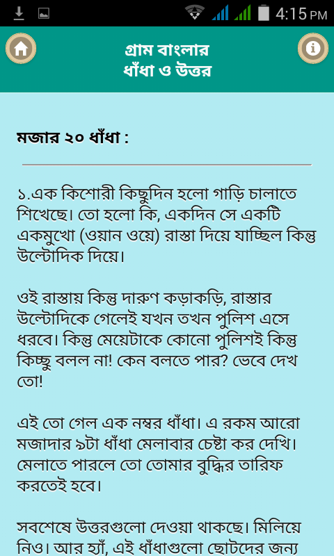 এমন কোন মানুষ খুঁজে পাওয়া যাবে না যে মজা করতে পছন্দ করে না। গ্রাম বাংলাতে ধাঁধার প্রশ্ন ও উত্তরের মাধ্যমে মজা করার প্রচলন অনেক দিনের। আমাদের এই অ্যাপ এ রয়েছে কিছু গ্রাম বাংলার সাড়াজাগানো ধাঁধার প্রশ্ন ও উত্তর।