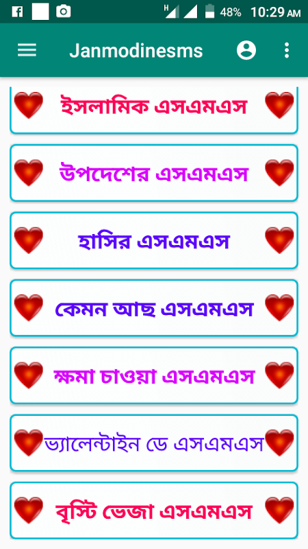 সবাই কে জানাই আন্তরিক অভিন্দন ও জন্মদিনের এসএমএস বন্দুদের পাঠানোর জন্য সুন্দর একটি অ্যাপ। এখানে আপনি পাবেন বাংলায় লিখিত চমৎকার সব মেসেজ। জন্মদিনের এসএমএস টি আপনাদের সকল বন্দু / বান্দবদের মাঝে কপি বা শেয়ার করে পাঠাতে পারবেন। এখানে মঝার মঝার বাংল এসএমএস পড়তে পাড়বেন এবং আপনার প্রিয় মানুষটি কে পাঠাতে পারবেন। এখন থেকে মন খুলে প্রিয় মানুষের কাছে ম্যাসেজে, মেসেন্জারে, ফেসবুকে, ইমোতে এছাড়াও আরো অনেক। কথায় আছে মনের মধ্যে গুরপাক খায় যা মুখে আসে না সেই সব কথা নিয়েই এবসটি সাজানো। এই বাংলা এসএমএস (জন্মদিন এসএমএস) Applicazione টি আপনাদের কেমন লাগলো অবশ্যই জানাবেন। ধন্যবাদ!