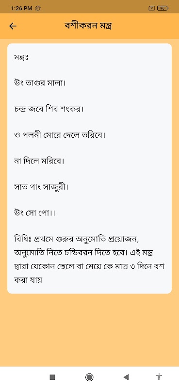 এর জন্য প্রয়োজন সঠিক বিদ্যা। বশ করা মানে কী? কাউকে বশ করা মানে নিয়ন্ত্রণ করা। অর্থাৎ একজন স্বকীয়ভাবে যা করত, তা করতে না দেওয়া কিংবা যা করত না, তা করিয়ে নেওয়া। চিন্তাকেও বশ করা যায়। অনেক সময় যে বশীভূত, সে বুঝতে পারে না যে বশ হয়েছে। এই অ্যাপে থাকছে নানা রকম বশীকরণ মন্ত্রের সমাহার।