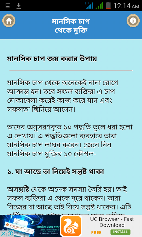 মানুষিক চাপ কিংবা দুশ্চিন্তা নাই এমন কোন মানুষ খুঁজেই পাওয়া যাবে না। মানসিক চাপ থেকে অনেকেই নানা রোগে আক্রান্ত হন। সঠিক উপায়ে বড় করে শ্বাস নিয়ে মানসিক চাপ কমানো যায়। মানসিক চাপ ব্যক্তিভেদে ভিন্ন কারণে হতে পারে। মানসিক চাপ একটু আধটু সবারই থাকে। মানসিক চাপ কমানোর সহজ উপায় হল, হাসুন, বন্ধুদের সঙ্গে আড্ডা দিন, মুভি দেখুন ইত্যাদি । আর আমাদের এই এপস জানতে পারবেন।