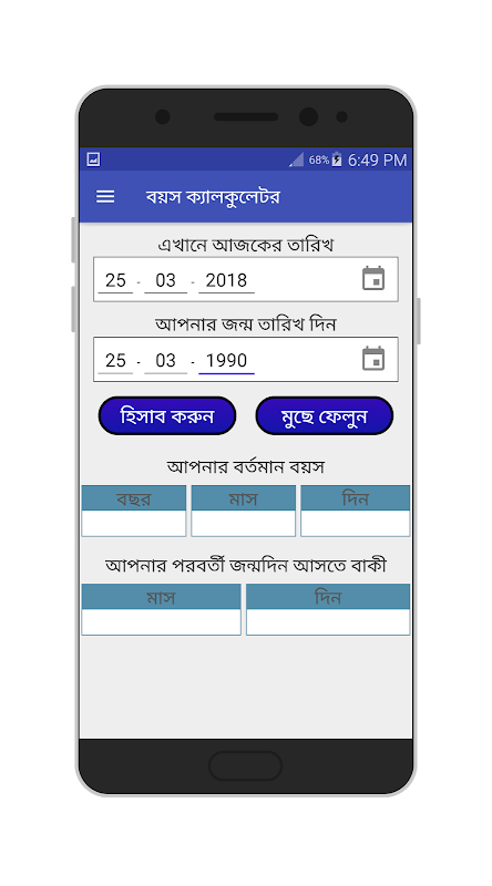 সঠিক ভাবে আপনার বয়স কত বছর তা জনতে চান তাহলে এখনি সংগ্রহ করুন আমাদের বয়স ক্যালকুলেটর টি, শুধু তাই নয় এছাড়া এর মাধ্যমে আপনি জানতে পারবেন আপনি আপনার জিবনে কত সেকেন্ন্ড, কত ঘন্টা, কত সপ্তাহ, কত দিন, কত মাস, অতিবাহিত করছেন.