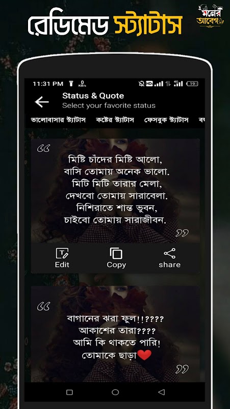 L'app Mind Emotions Abeg ha molti modelli di didascalie per sms bangla di stato con molti sfondi e immagini.