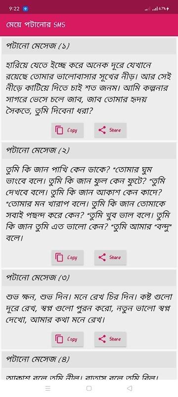 মেয়ে পটানোর রোমান্টিক এসএমএস আশা করি এই অ্যাপটি আপনার ভাল লাগবে। আপনি অফ লাইন এই অ্যাপটি চালাতে পারবেন এবং SMS কপি করে আপনার বন্ধুদের সাথে শেয়ার করতে পারবেন । আপনার ভাল লাগা মন্দ লাগা বিষয় গুলো আমাদের রিভিউর মাধ্যমে জানান। আর ভাল লাগলে অবশ্যই বন্ধুদের সাথে শেয়ার করুন।