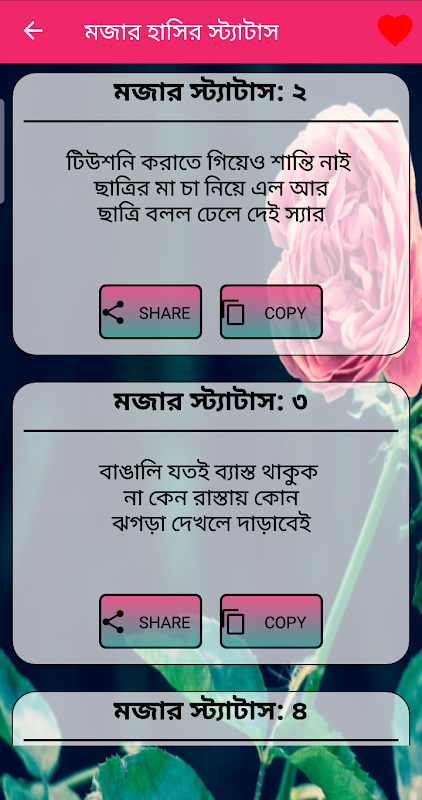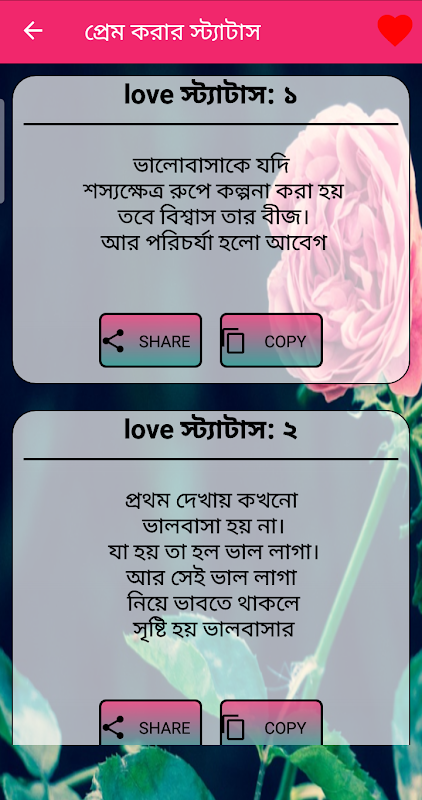 এই অ্যাপসটিতে যে সব মোবাইলে প্রেম করার স্ট্যাটাস আছে তা অপনি বন্দুদের সাথে ১ কিল্কে কপি এবং শেয়ার করতে পারবেন ।
