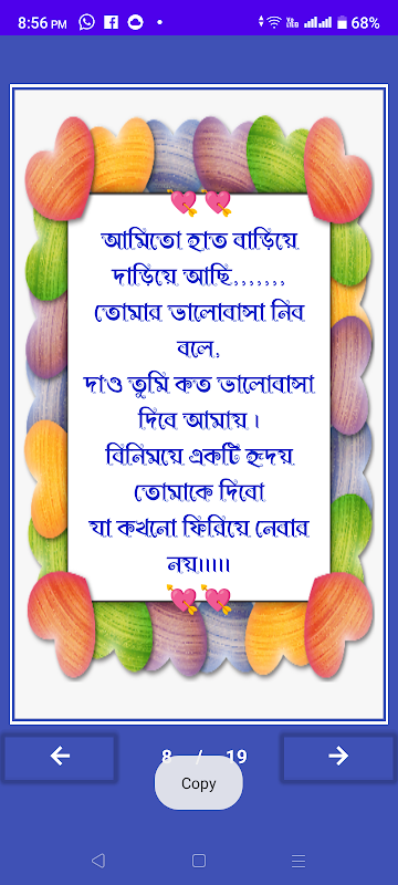 আমাদের এই অ্যাপে সুন্দরী মেয়েদের পটানো রোমান্টিক বাংলা সকল এসএমএস কালেকশন ইন্টারনেট ছাড়াই খুব সহজেই উপভোগ করতে পারবেন এবং প্রিয় মানুষদের কাছে কপি করে বিভিন্ন সোশ্যাল সোশ্যাল মিডিয়াতে শেয়ার করতে পারবেন