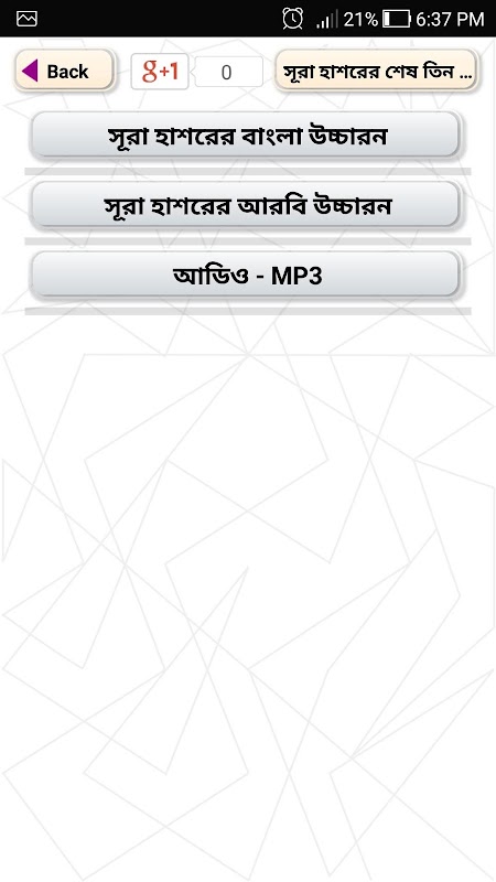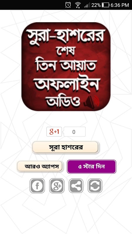 Sura hasor is very important for all muslim. Sura hasor bangla pronunciation is given here. Sura hasor last 3 ayat audio is recited here so nicely. Surah hashr last 3 ayal has a lots of benefit. sura hasor last 3 ayat is an educational applicaton. Surah hashr should known by all of us surah hashr last 3 ayat bangla is very easy to understand. Surah hashr last 3 ayat audio can be listen when you will stay online.Sura hasor mp3 also included. Without internet shrah hashr audio can’t be played. But you can read both arabic and bangla from this app.