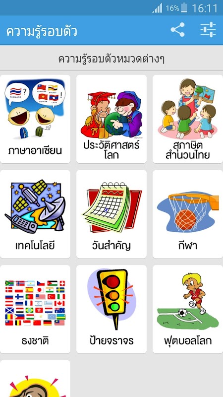 15. ASEAN Language, 16. World History, 17. Proverbi, Thai Idioms 18. Tecnologia 19. Date importanti 20. Sport 21. Bandiere 22. Segnali stradali 23. Coppa del mondo, 24. Razze di cani