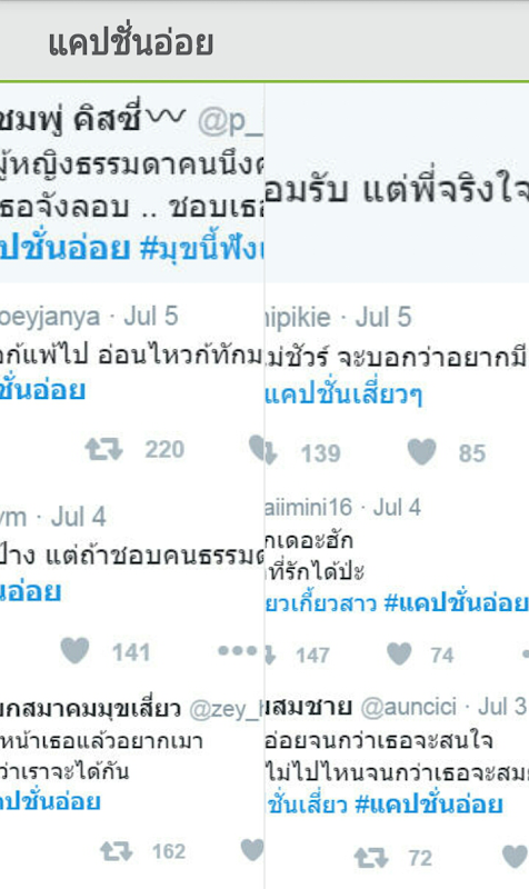 แอพพลิเคชั่นรวบรวมแคปชั่นอ่อย แคปชั่นเสี่ยว แคปชั่นโดนๆ ประโยคเด็ดๆ รวบรวมเอามาไว้ให้ทุกท่านได้นำไปโพสต์กันใน Facebook, Line, Twitter แคปชั่นอ่อยประโยคไหนที่โดนใจ ก็ลองเอาไปโพสต์กันดูนะ รับรองหัวเราะกระจาย กดไลค์กระจุย ไม่ว่าจะเป็นแคปชั่นอ่อย แคปชั่นฮาๆ แคปชั่นจีบสาว แคปชั่นความรัก แคปชั่นเสี่ยว แคปชั่้นกวนๆ แคปชั่นทะลึ่งๆ แคปชั่น IG รวมแคปชั่นอ่อยเด็ดๆ บาดจิตบาดใจแน่นอน แคปชั่นเหล่านี้ผ่านการคัดกรองมาอย่างดีจากทีมผู้พัฒนา อ่านแล้วโดน อ่านแล้วจี๊ดใจ อ่านแล้วขำกลิ้ง หลากหลายอารมณ์ สามารถเซ็ตเป็นวอลเปเปอร์, เซฟเก็บไว้ในเครื่อง หรือแชร์ให้เพื่อนๆ ดูได้ โดยจะมีการอัพเดตแคปชั่นอ่อยฮาๆ แคปชั่นโดนใจเพิ่มขึ้นเรื่อยๆ