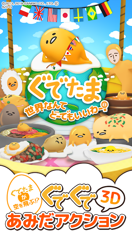サンリオ1の脱力系?あのぐでたまが3Dに! ぐるぐる回転するステージを、簡単ワンタップアクションで攻略♪ レシピを求めて世界中を飛び回る!?新感覚【ぐでぐであみだアクション】ぐでせか登場