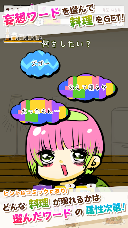 Parole deliranti appaiono quando raccogli gli ingredienti che galleggiano sullo schermo! 60 tipi di piatti appariranno nella combinazione di parole selezionate.