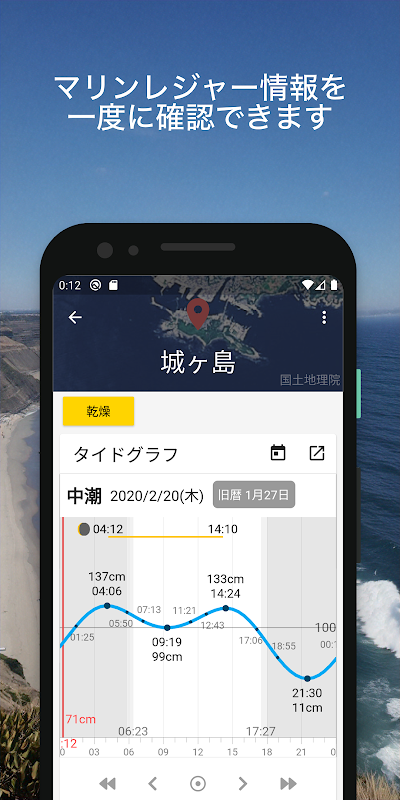 Un grafico delle maree che ti consente di scorrere orizzontalmente e vedere il passato e il futuro scorrere per sempre. Uno strumento eccellente che ti consente di controllare contemporaneamente il nome della marea, il sorgere e il tramontare della luna. Durante lo scorrimento è inoltre possibile verificare il livello della marea in unità di tempo dettagliate. Dispone inoltre di una funzione di ingrandimento che visualizza solo il grafico delle maree su uno schermo.
