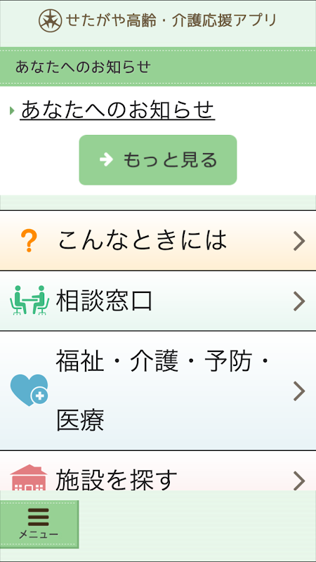 高齢者福祉や介護サービス情報が検索できる世田谷区公式アプリです。認知症や健康についてのチェック機能も搭載しています。