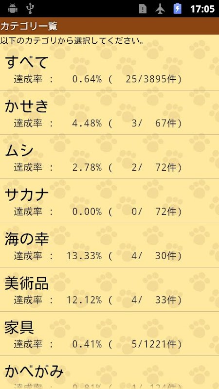 アイテムなどの取得有無をチェックリスト形式で登録でき、カテゴリ毎(家具やサカナなど)の達成率を確認することができます。