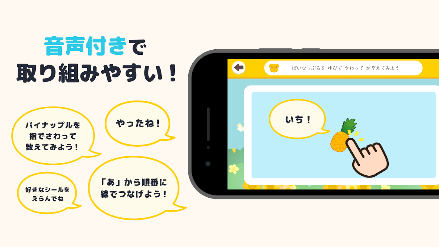 Sukusuku Plus è stato sviluppato da Piyolog, un'app di registrazione per l'infanzia, ed è stato sviluppato con l'idea di poter supportare lo sviluppo intellettuale dei bambini attraverso un'app durante la loro prima infanzia. Divertendoti con i giochi, sarai naturalmente in grado di scrivere hiragana, katakana e numeri, comprendere forme e schemi e acquisire saggezza attraverso la memorizzazione e la selezione. Ci auguriamo che lo troverai utile nello sviluppo di tuo figlio.