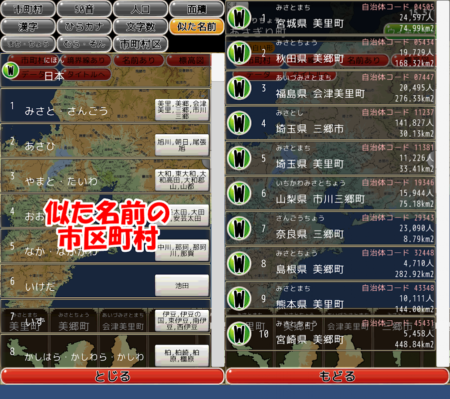 ・Visualizza un elenco di comuni con nomi simili come "Misato-cho, Misato-cho, Misato-cho"