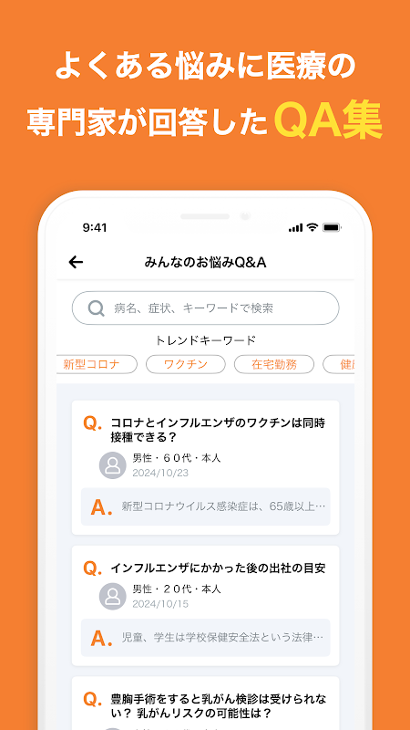 Una raccolta di domande e risposte creata riorganizzando i casi particolarmente turbati da molte persone dalle consultazioni di salute fisica e mentale, che ricevono 100.000 casi all'anno. Migliaia di domande e risposte ad ampio raggio, come malattie/sintomi, salute del bambino, dubbi sulla droga, cura di sé, ansia per i risultati delle visite mediche, cure a lungo termine e salute mentale, ti aiuteranno a trovare la soluzione giusta per te.