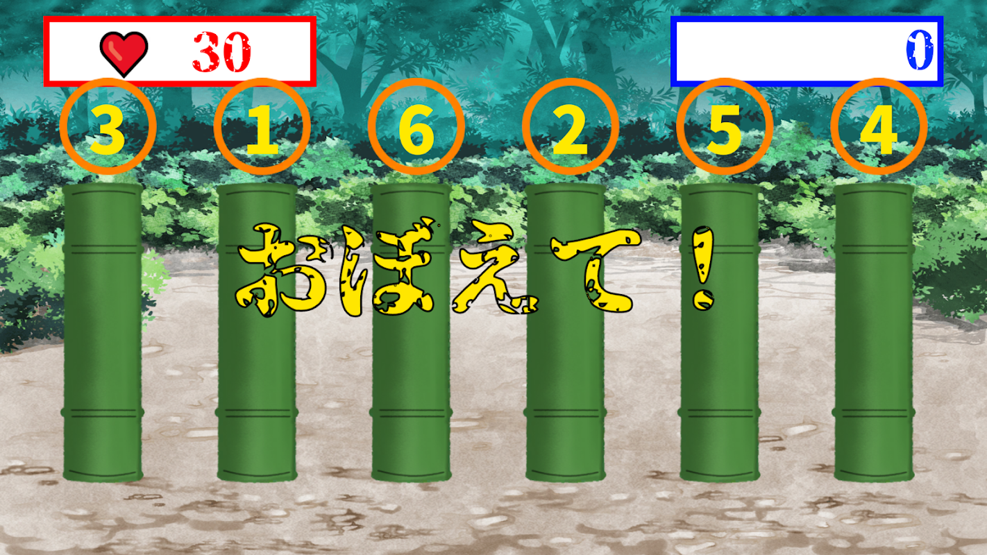 Un semplice gioco in cui devi solo memorizzare i numeri dei bambù allineati e tagliarli con una spada nell'ordine dei numeri che hai memorizzato!
