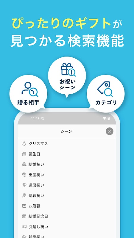 Puoi trovare il regalo perfetto per la persona amata semplicemente selezionando il "destinatario del regalo" e la "scena della celebrazione".