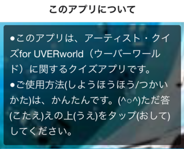 ●このアプリは、アーティスト・クイズfor UVERworld(ウーバーワールド)に関するクイズアプリです。