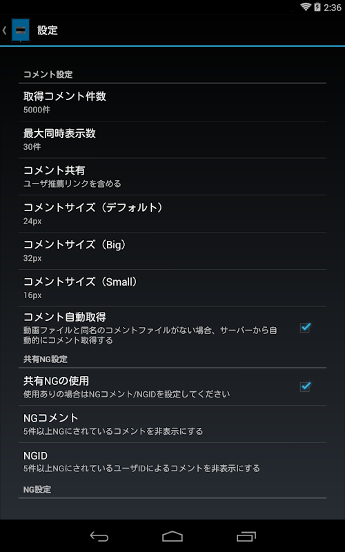 ・NG設定(NGID/NGワード/NGコマンド)は当デベロッパーが開発した他アプリからインポート、もしくは他アプリへエクスポートする事ができます。